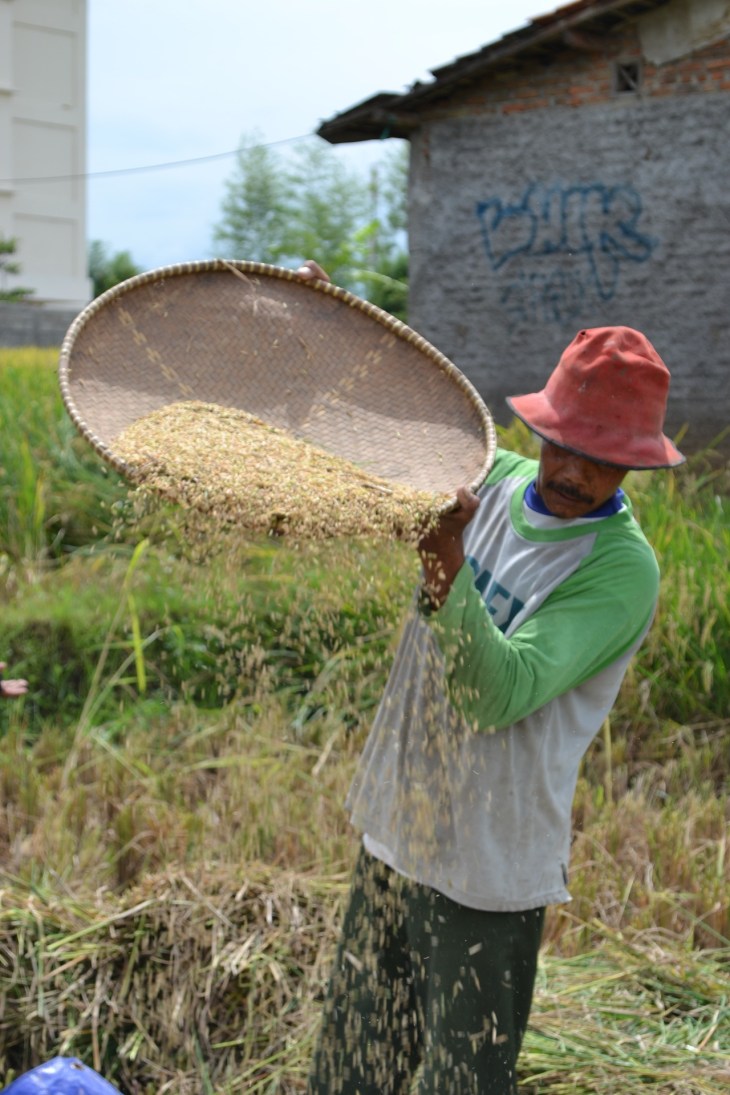 petani tersebut sedang panen dan mengayak padinya untuk memisahkan padi yang kurang baik.